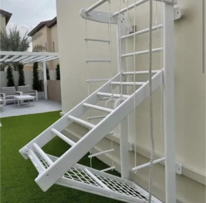 We offer monkey bar configurations suited to different home sizes, age ranges, and budgets. Here’s a simple framework for choosing: For toddlers and preschoolers as the primary users: Start with a lower-mounted bar configuration and include a rope ladder for access. Prioritise surface-to-bar height carefully the lower the bars, the shorter the drop, and the more independently young children can use the structure.