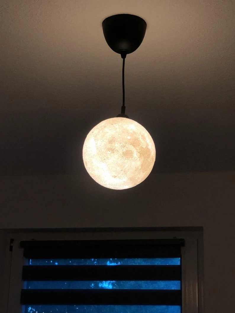 Crafted with attention to detail, the lamp features a realistic lunar surface design that enhances its visual appeal, inspiring imagination and a love for the night sky. Suspended elegantly from the ceiling, it serves as a captivating centrepiece that complements nurseries, kids’ rooms, or even playrooms. The lamp’s soft illumination is perfect for creating a relaxing and soothing environment, helping children feel comfortable and at ease as they fall asleep.