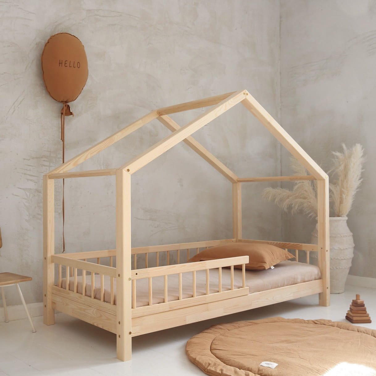 Transform your child’s bedroom into a dreamy and functional space with our Montessori house bed, crafted from high-quality natural wood. Designed to promote independence, creativity, and comfort, this bed’s charming house-shaped frame adds a playful touch while providing a secure and cozy sleeping area. The low-to-the-floor design ensures easy access for toddlers, making it perfect for Montessori-style parenting. Built with safety rails, it offers added protection, allowing your little one to sleep and play confidently.