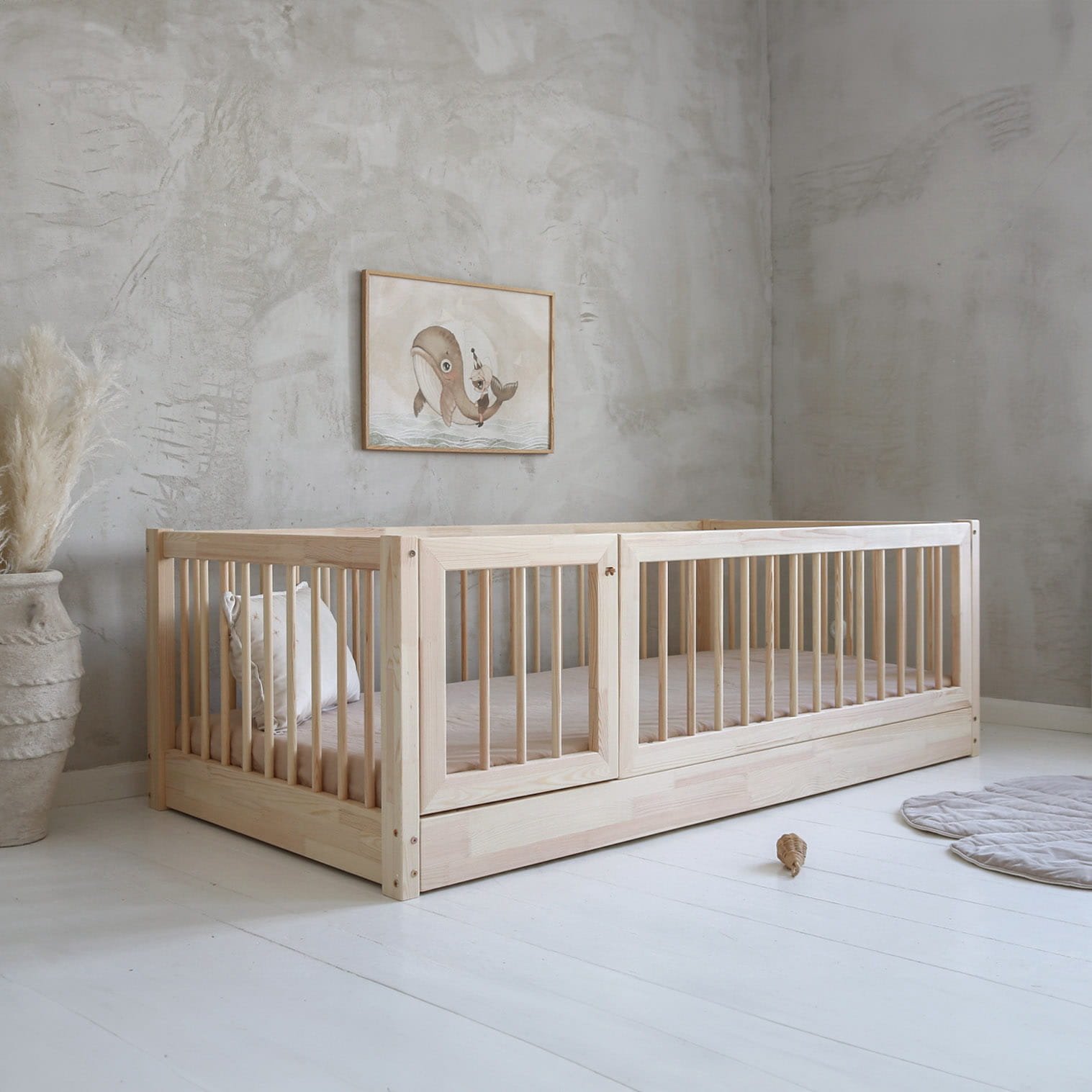 Create a safe, cozy, and independent sleep environment for your child with our Montessori floor bed, crafted from high-quality natural wood. Designed with wooden rails and a secure, lockable gate, this bed provides the perfect balance of safety and freedom, allowing toddlers to explore their space with confidence. The low-to-the-ground design encourages independence, making it easy for little ones to get in and out of bed on their own. Perfect for Montessori-style parenting, this bed promotes self-reliance while ensuring a secure and comfortable sleep space.