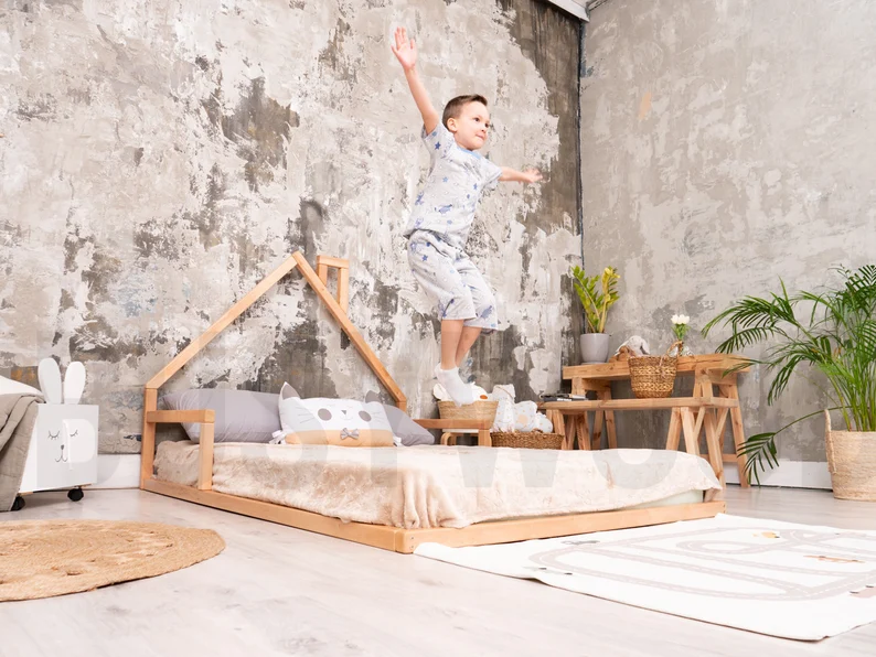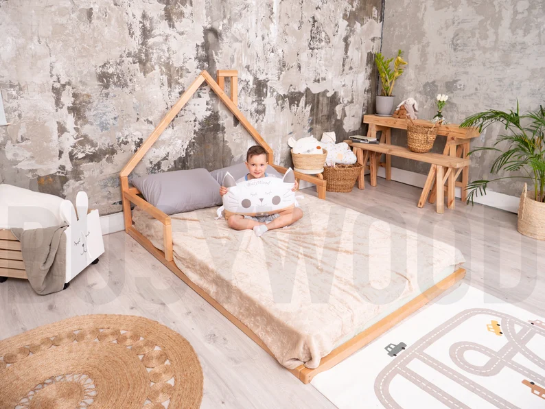 A toddler floor bed is a low-to-the-ground bed designed for young kids. It gives safety and freedom to move in and out easily. Perfect for Montessori-style bedrooms, helping kids be independent. Made with sturdy wood and comes in fun designs and colors. No need for high rails, reducing the risk of falls. A cozy, comfy, and fun sleeping space for little ones!