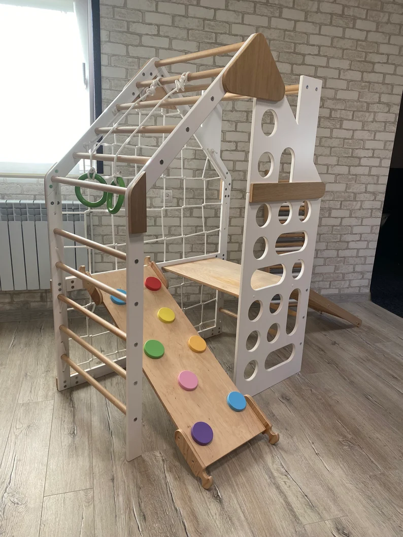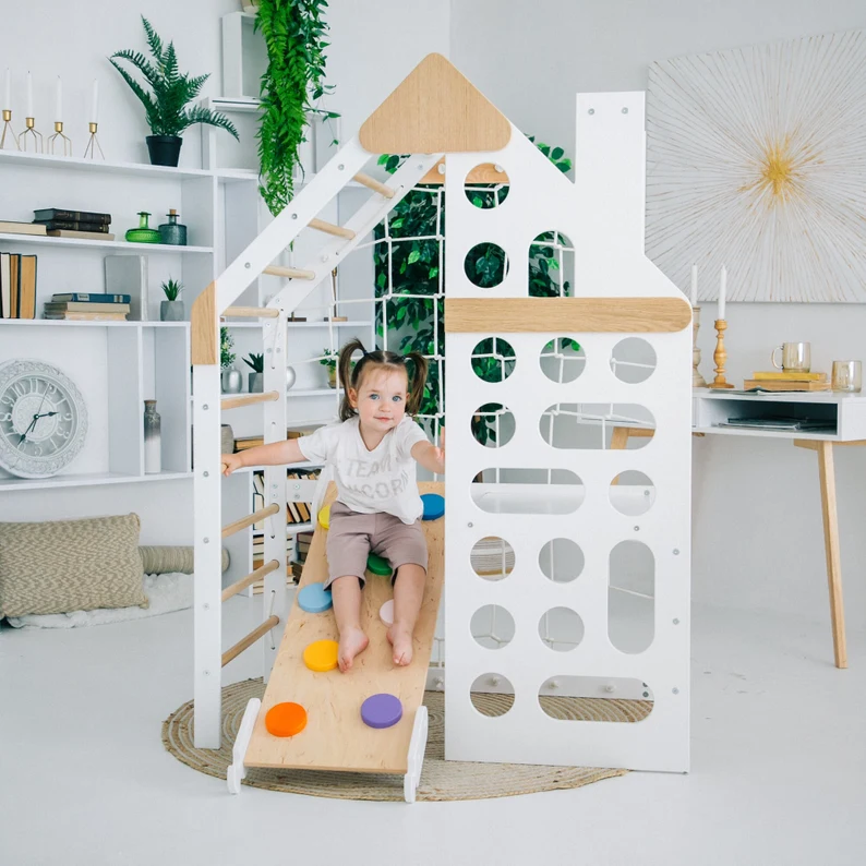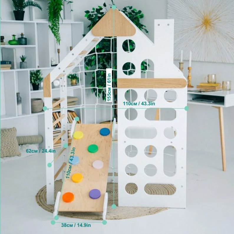 Transform your home into a world of adventure with this indoor kids’ activity playhouse! Designed for fun and development, it features a climbing wall, slide, and ladder to promote motor skills, balance, and strength. Crafted with eco-friendly wood, the minimalist yet modern design blends seamlessly into any home decor. Vibrant details like colorful grips and smooth edges ensure safety and endless hours of entertainment for toddlers and young children. Perfect for playrooms, nurseries, or shared family spaces, this compact setup encourages active play, creativity, and bonding. Easy to assemble and durable, it’s the ultimate combination of functionality and fun.