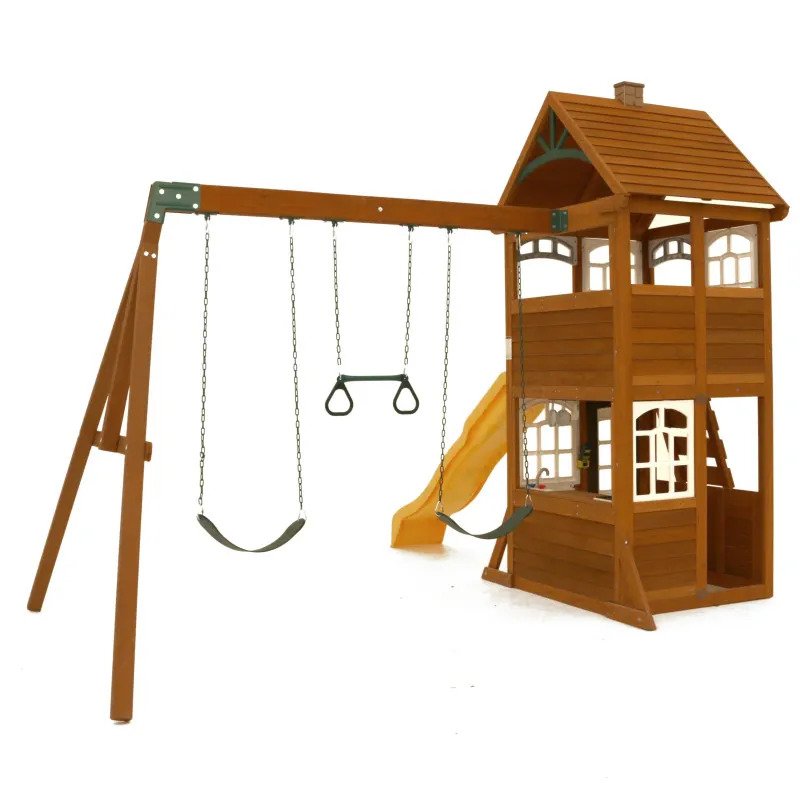 Crafted with high-quality, durable lumber, this playset is built to withstand years of play. The gabled shiplap roof adds a charming touch to the design, while premium swing components ensure safety is a top priority. The Playset combines fun, functionality, and durability, offering a high-energy play experience in a compact package. Perfect for smaller yards, it provides hours of entertainment and imaginative play, with features both kids and adults will love.