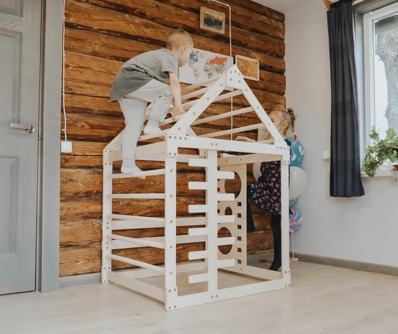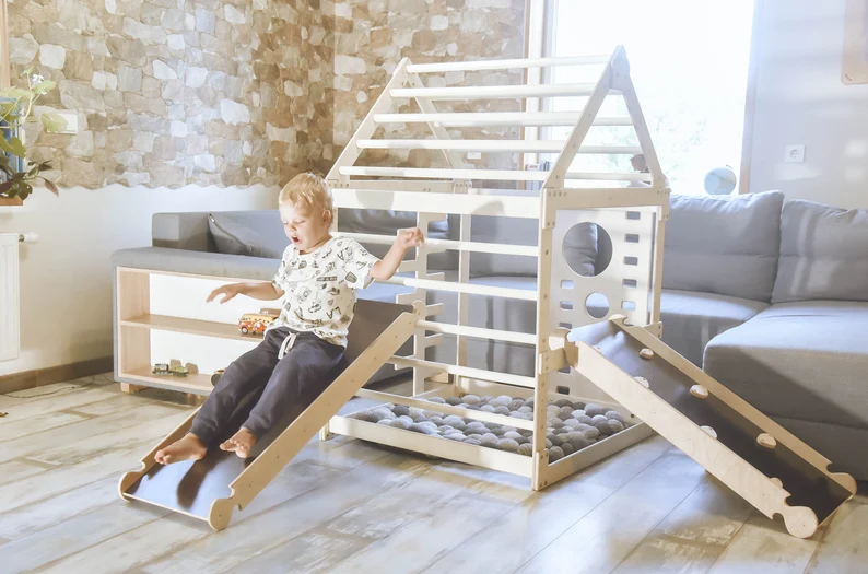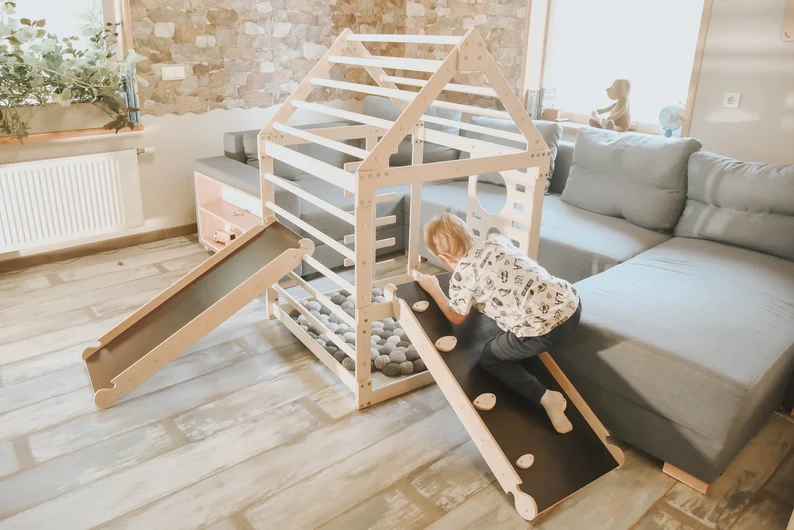 Montessori activities are a fun and engaging way to keep your little one active and promote healthy development. Designed with little climbers, sliders, and explorers in mind, this beautifully crafted playhouse with a slide is perfect for encouraging your child to explore their surroundings. Upgrade your child’s physical abilities with Montessori indoor playground climbing gym with a slide designed for your baby/toddler/child to explore and learn about the world around them through play. This well-tested design is made to encourage your little ones to play. Kids from an early age will develop coordination, strength, and balance in a natural and fun way.