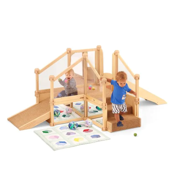 The Sand Dune Gym offers a ramp, stairs, and slide, creating an engaging play environment for babies and toddlers. The exciting slide is perfect for adventurous children seeking thrilling movement and fun-filled activity. The ramp and stairs provide a safe climbing challenge for less mobile babies to explore confidently. Designed with modular parts, it allows easy reconfiguration to adapt to changing nursery needs. A tool-free connecting system ensures quick and hassle-free assembly for busy caregivers. Crafted from high-quality wood, it features a clear, child-safe finish for long-lasting durability.